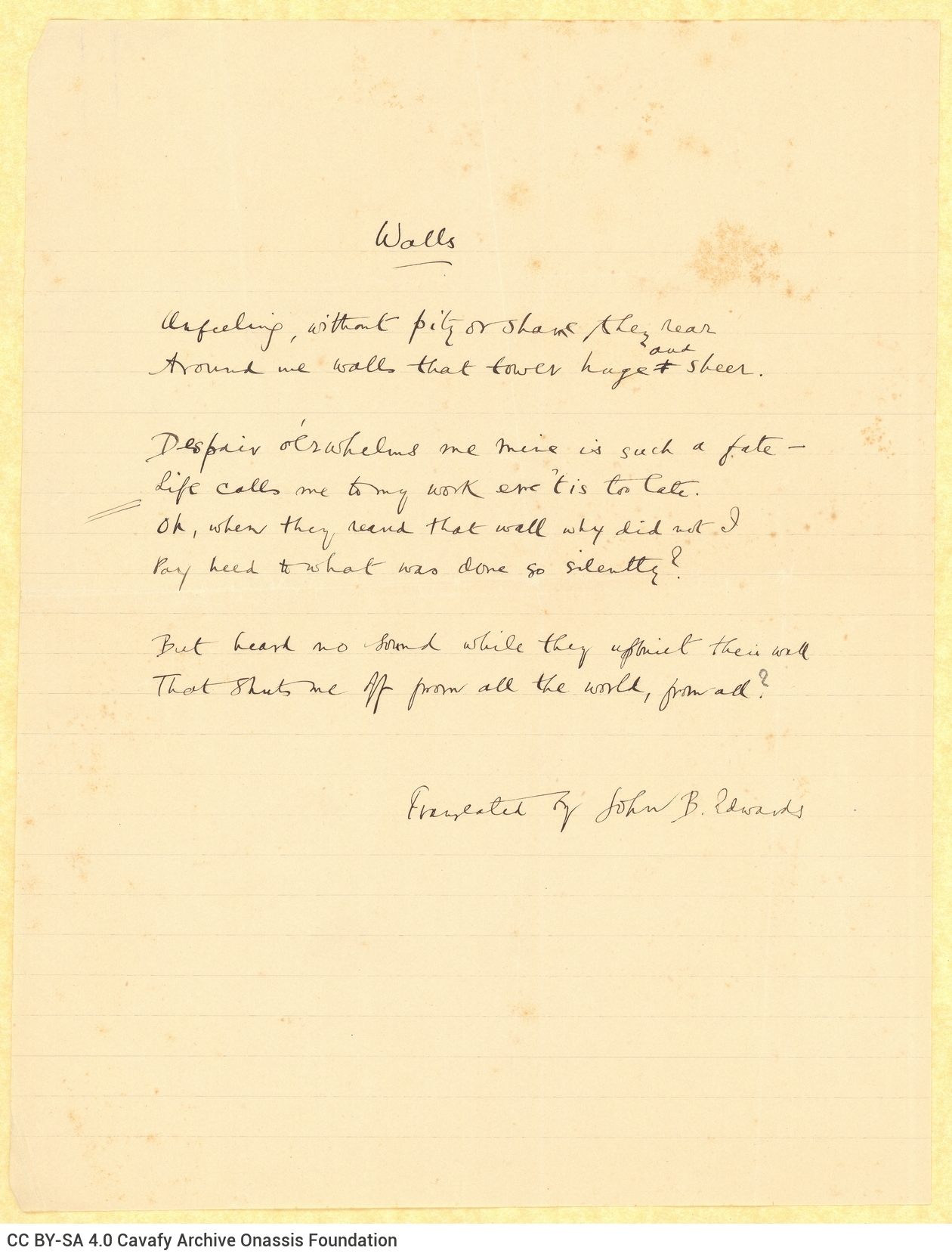 Draft letters by Cavafy to John B. Edwards, translations of poems