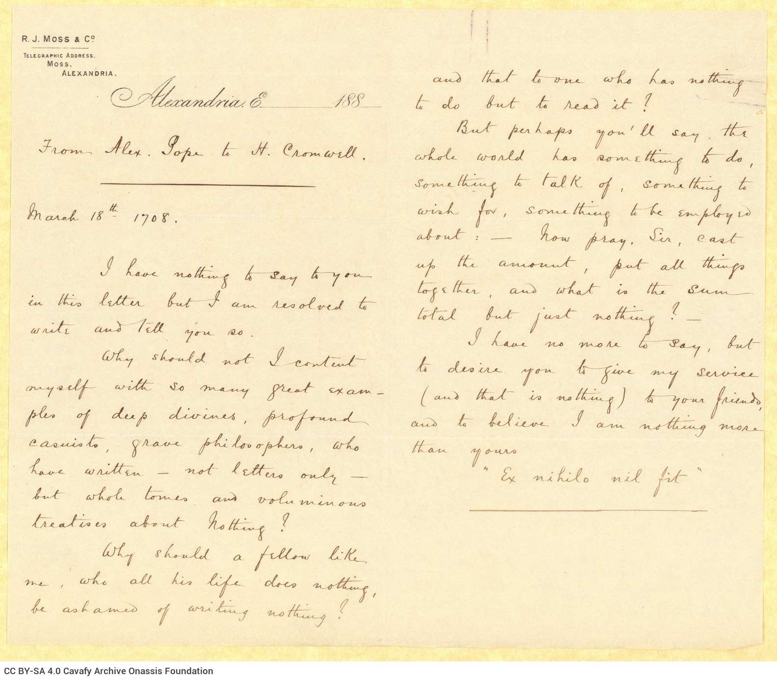 Επιστολή του John Καβάφη προς τον Κ. Π. Καβάφη