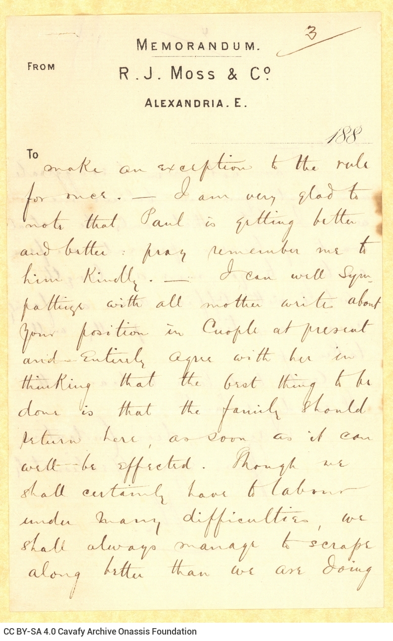 Letter by John Cavafy to C. P. Cavafy