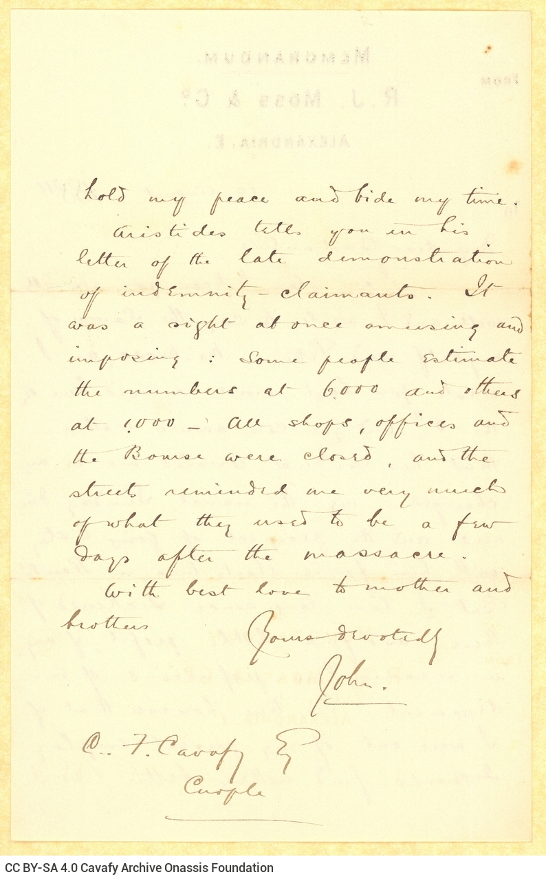 Letter by John Cavafy to C. P. Cavafy