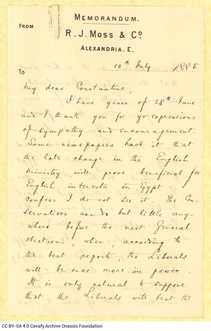 Επιστολή του John Καβάφη προς τον Κ. Π. Καβάφη