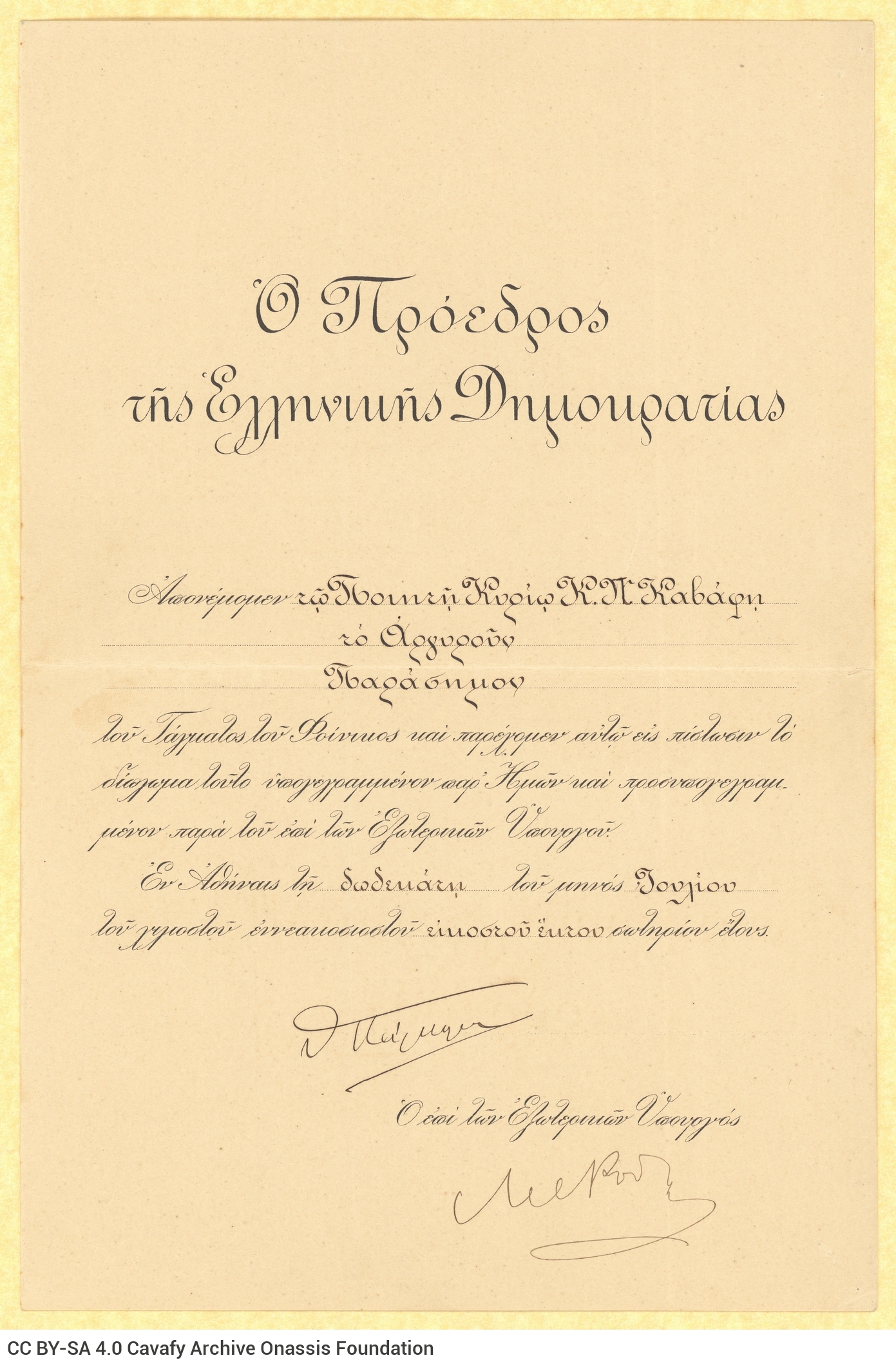 Silver Medal of the Order of the Phoenix and accompanying letter by the Consul General of Greece in Alexandria, Marinos Sigouros
