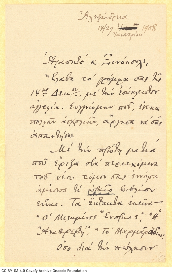 Σχέδιο επιστολής του Καβάφη προς τον Γρ. Ξενόπουλο