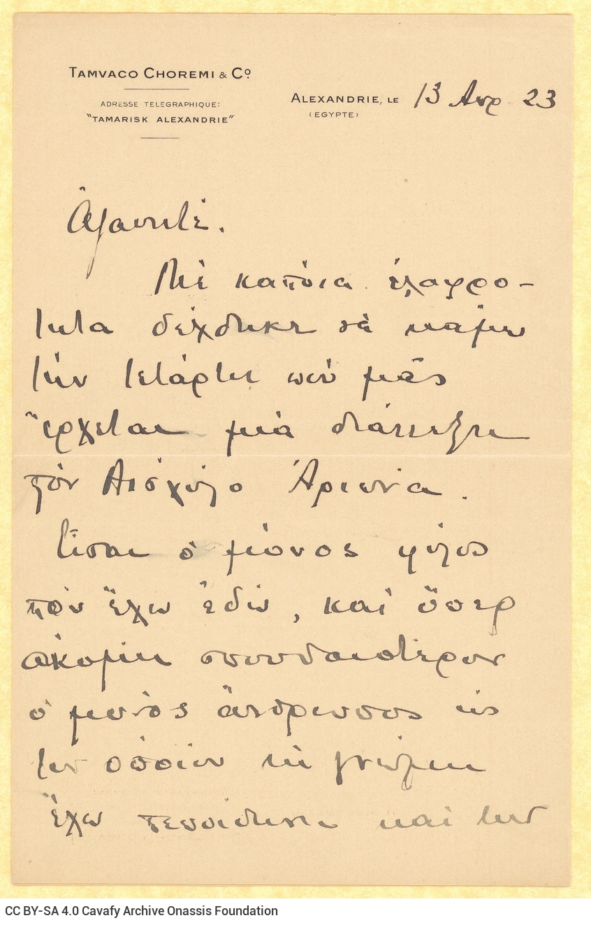 Letter by Christoforos Nomikos to C. P. Cavafy