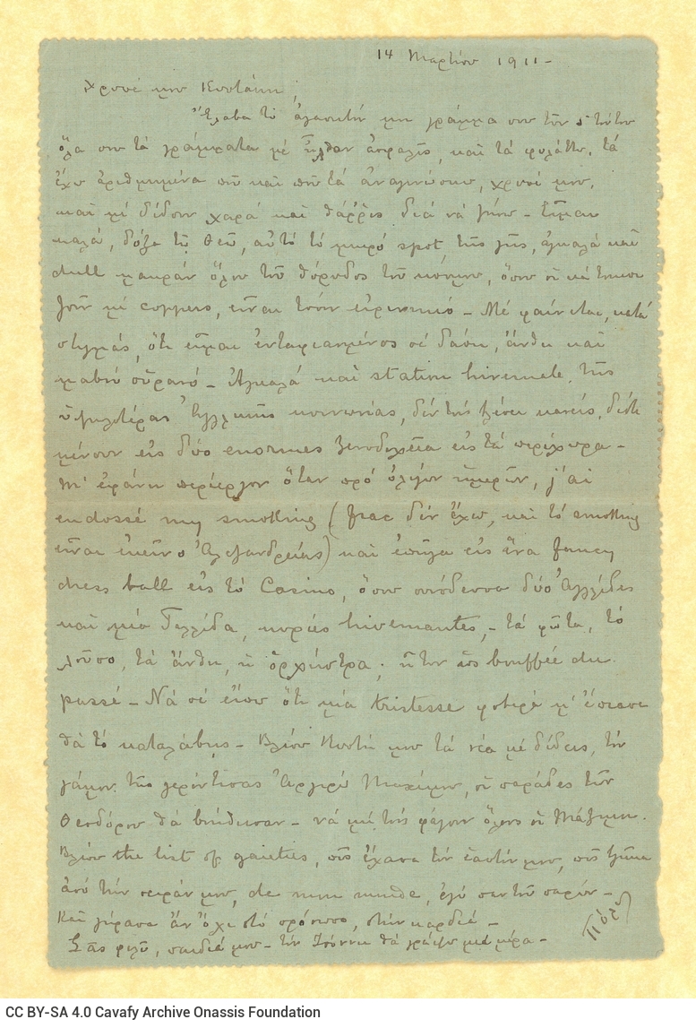Letter by Paul Cavafy to C. P. Cavafy