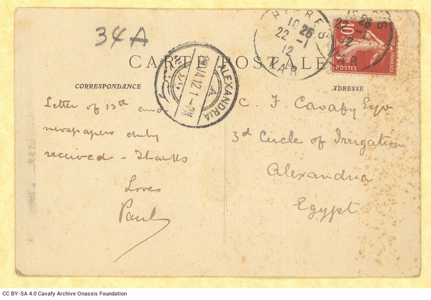 SF002 - Εισερχόμενη αλληλογραφία από τον Παύλο Καβάφη