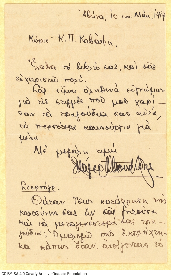 Επιστολή του Ν. Χάγερ Μπουφίδη προς τον Καβάφη