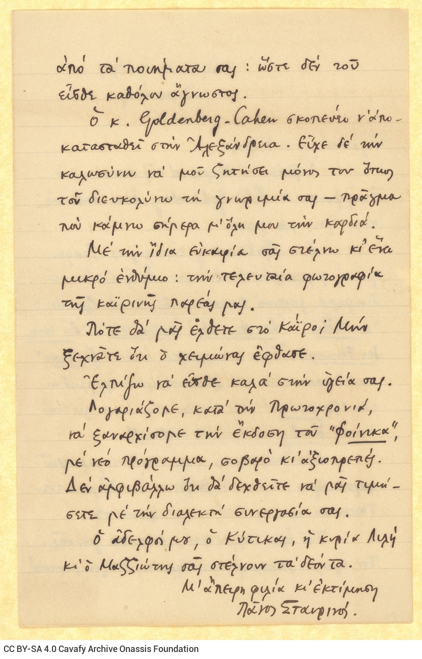 Επιστολή του Π. Σταυρινού προς τον Καβάφη