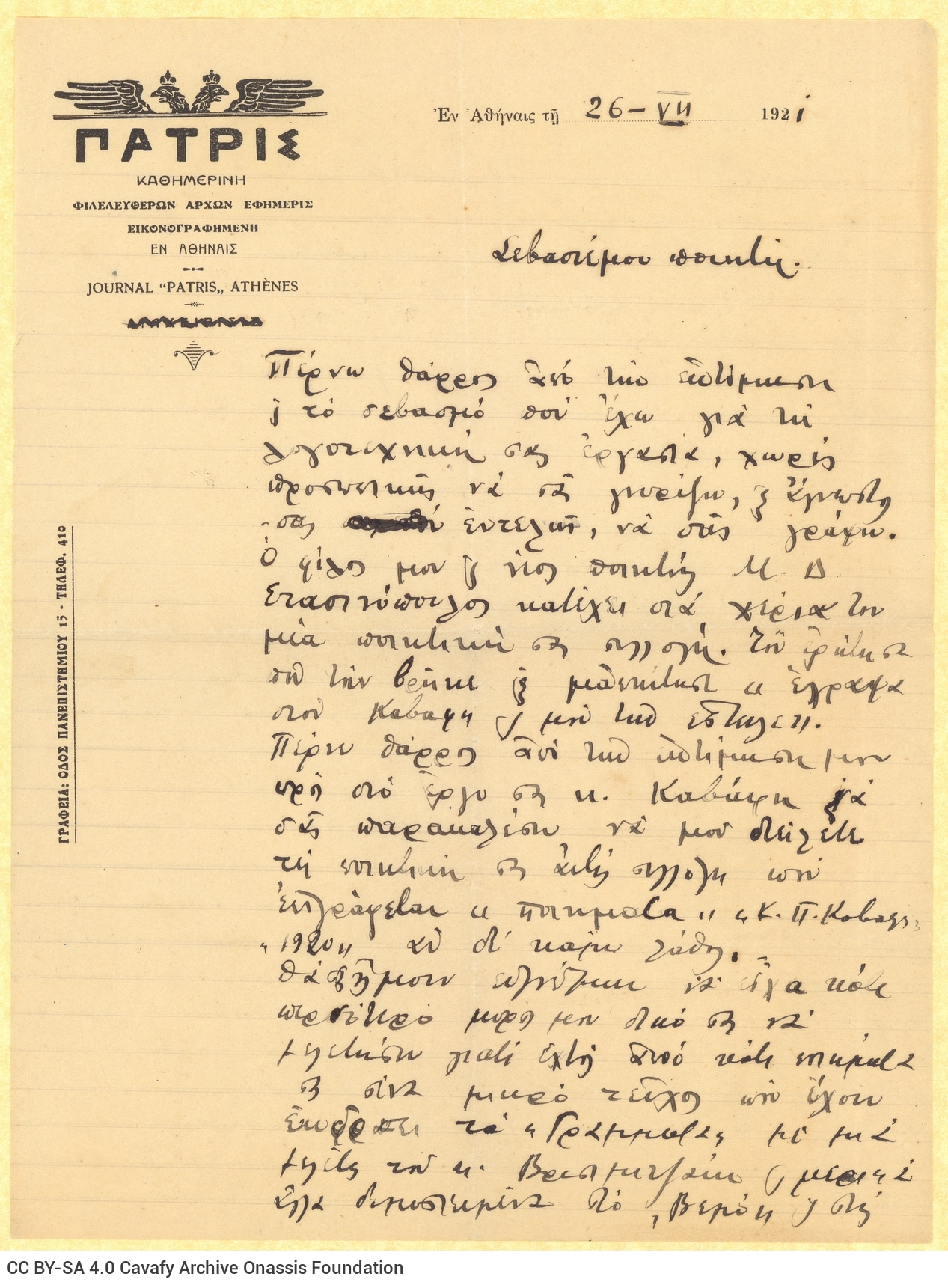 Letter by M. Th. Grigoriou to Cavafy