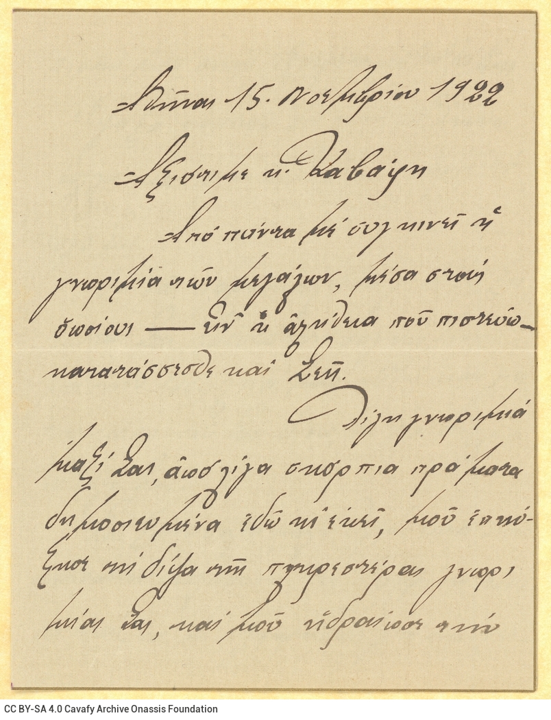 Letter by P. Karanikolas to Cavafy
