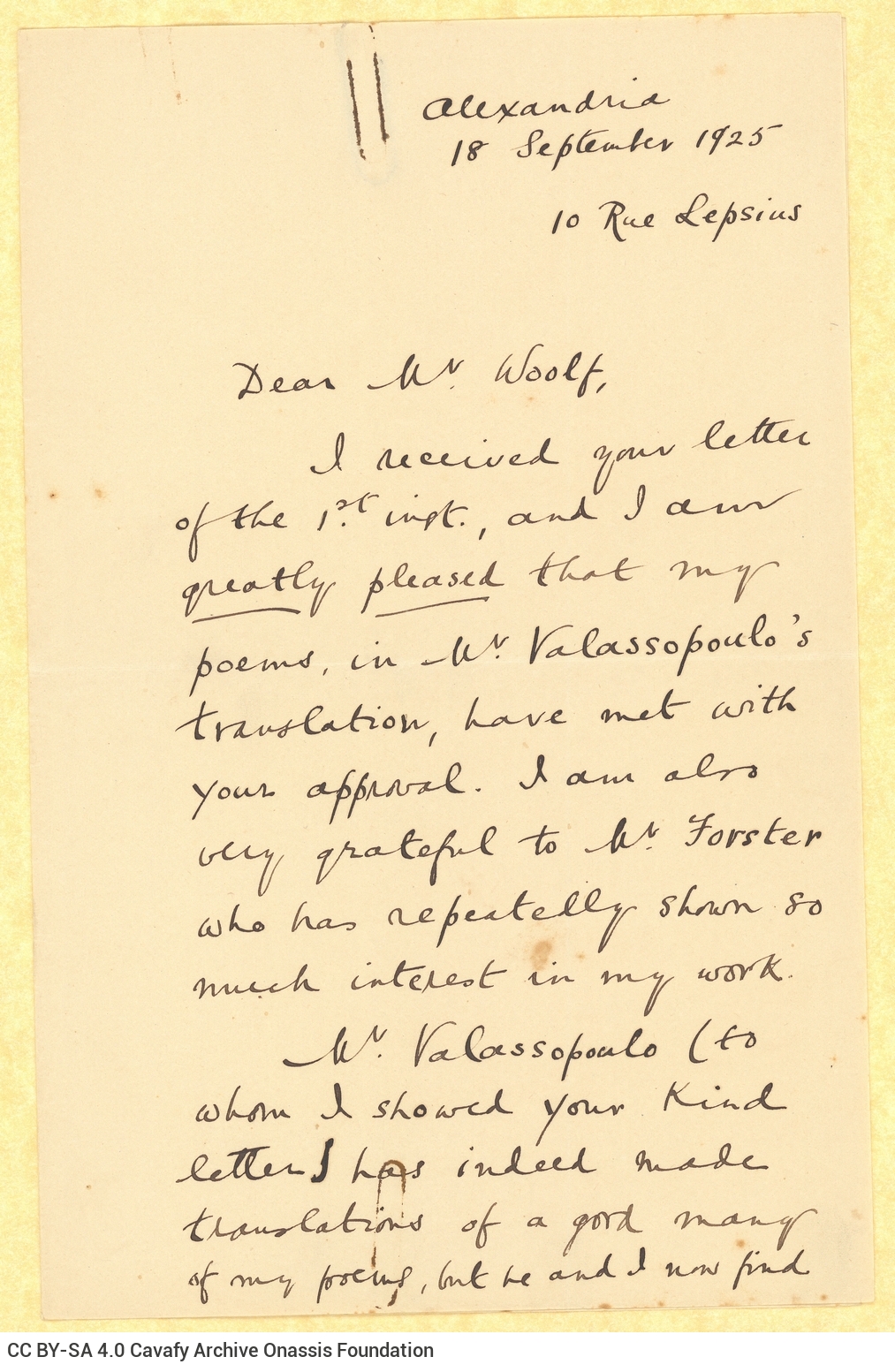 Draft of a letter by Cavafy to Leonard Woolf