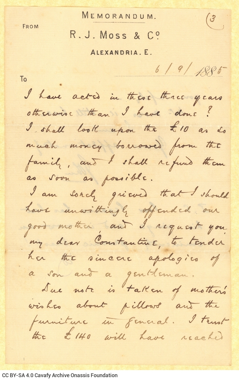 Επιστολή του John Καβάφη προς τον Κ. Π. Καβάφη