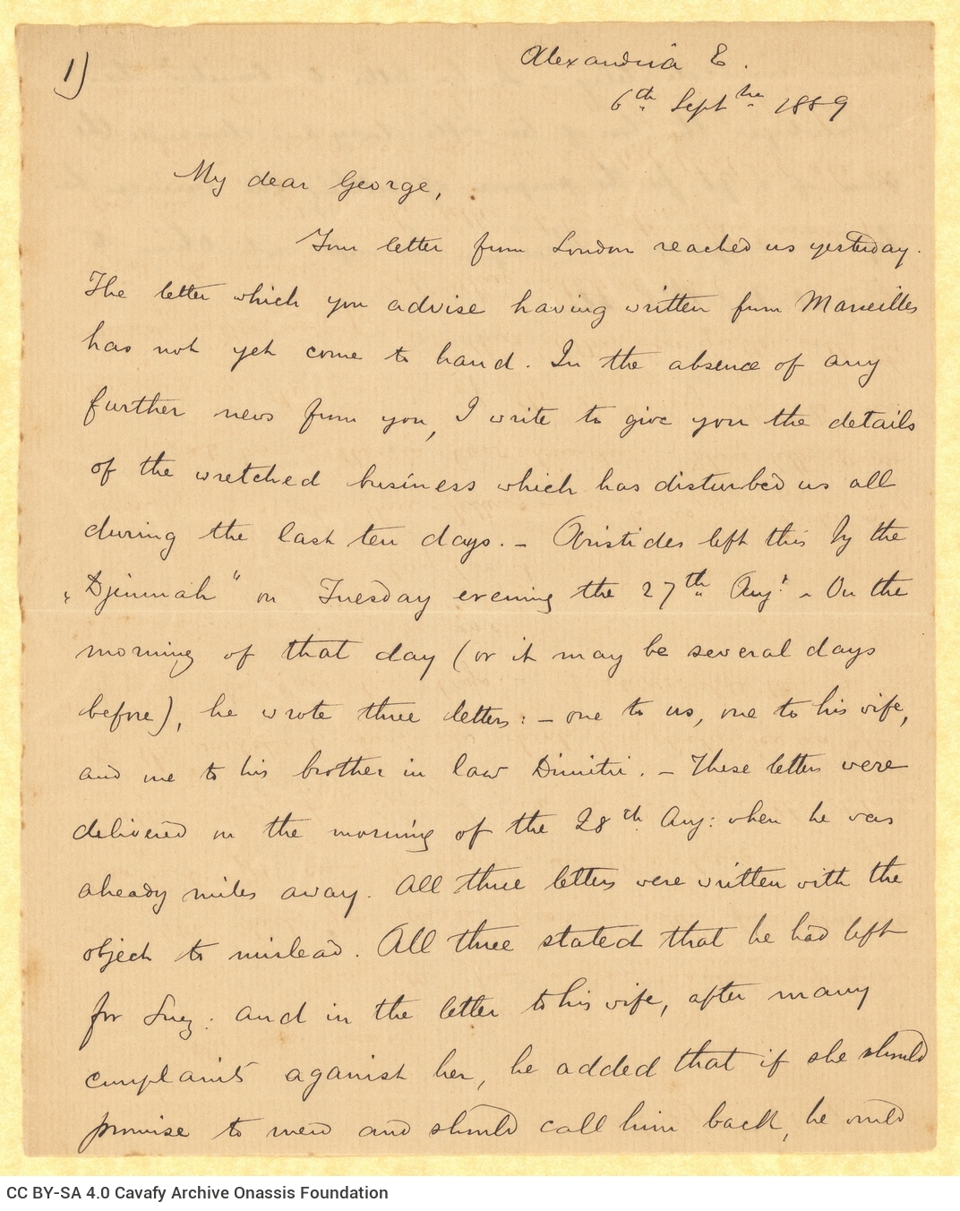 Σχέδιο επιστολής του J. Καβάφη προς τον Γ. Καβάφη