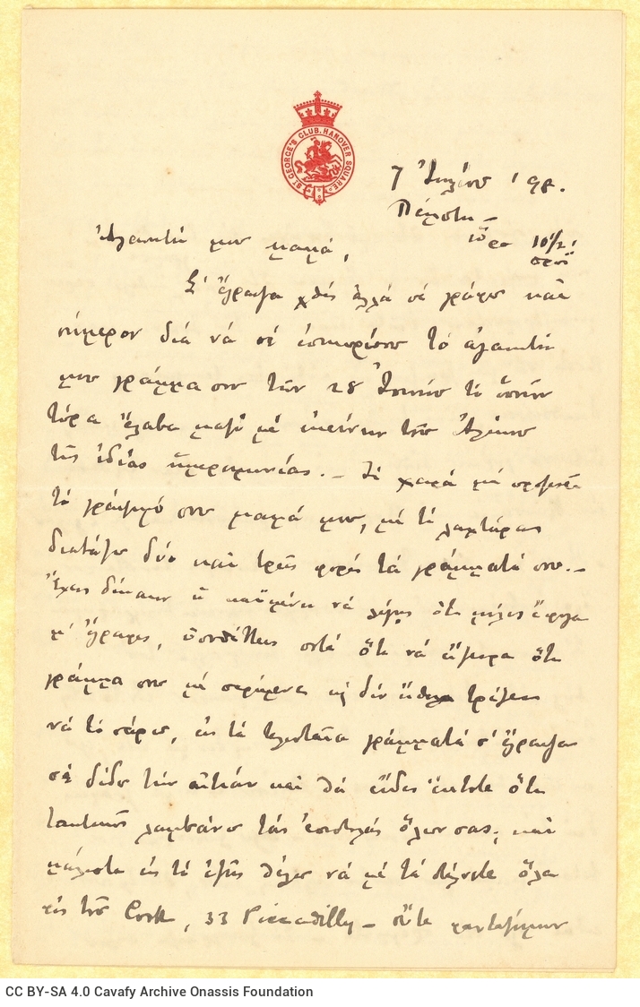 0019 (1161) - Letter by P. Cavafy to Ch. Cavafy