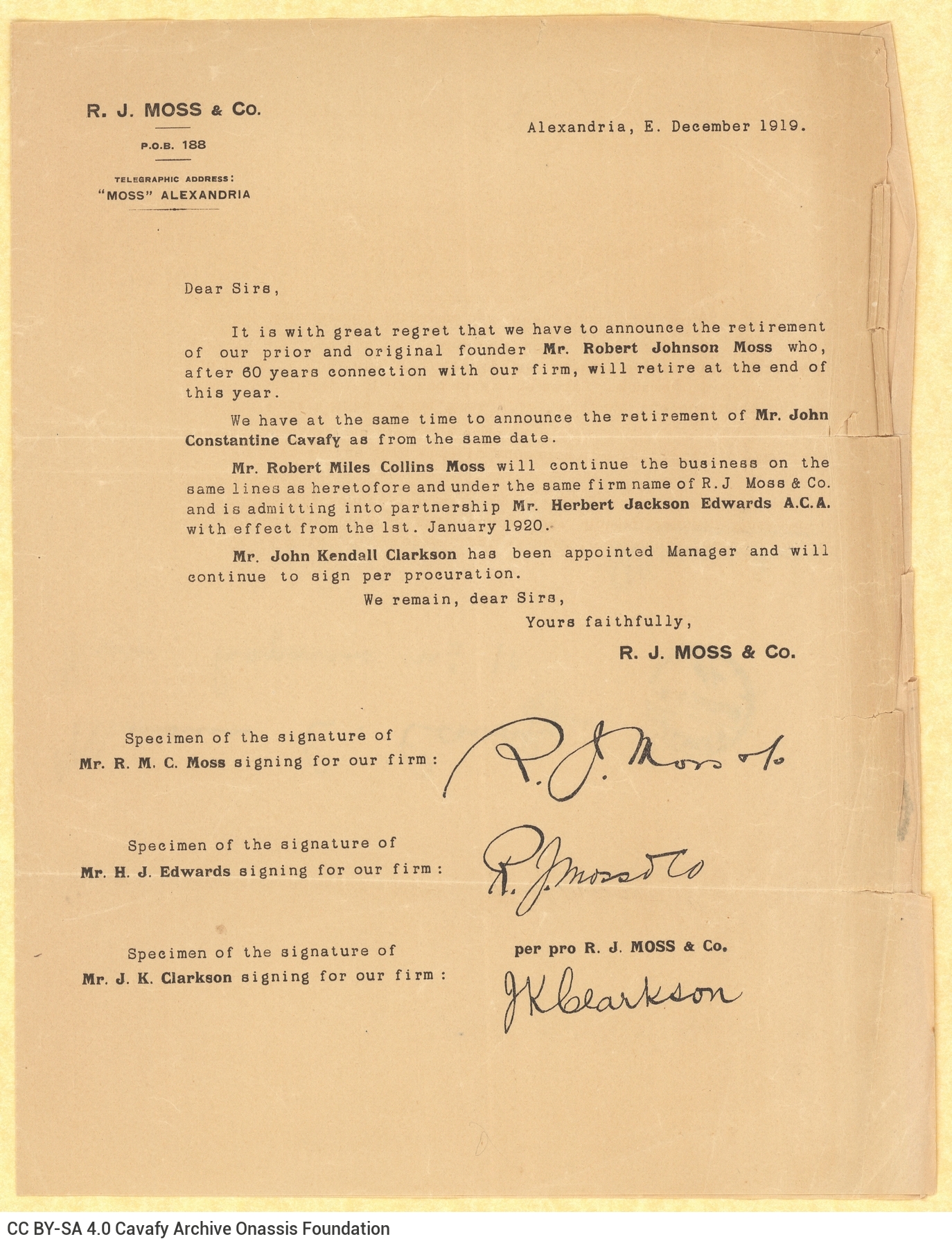Letter from Moss & Co. to Cavafy
