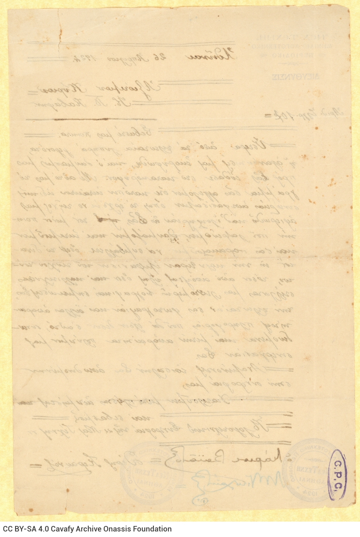 Letter by M. Vaianos, Th. Keravnos, Μ. Nikolaidis to Cavafy