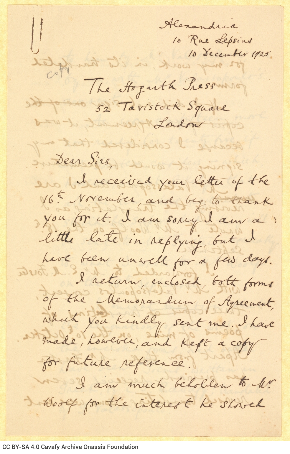 Copies of a letter by Cavafy to The Hogarth Press publishing house