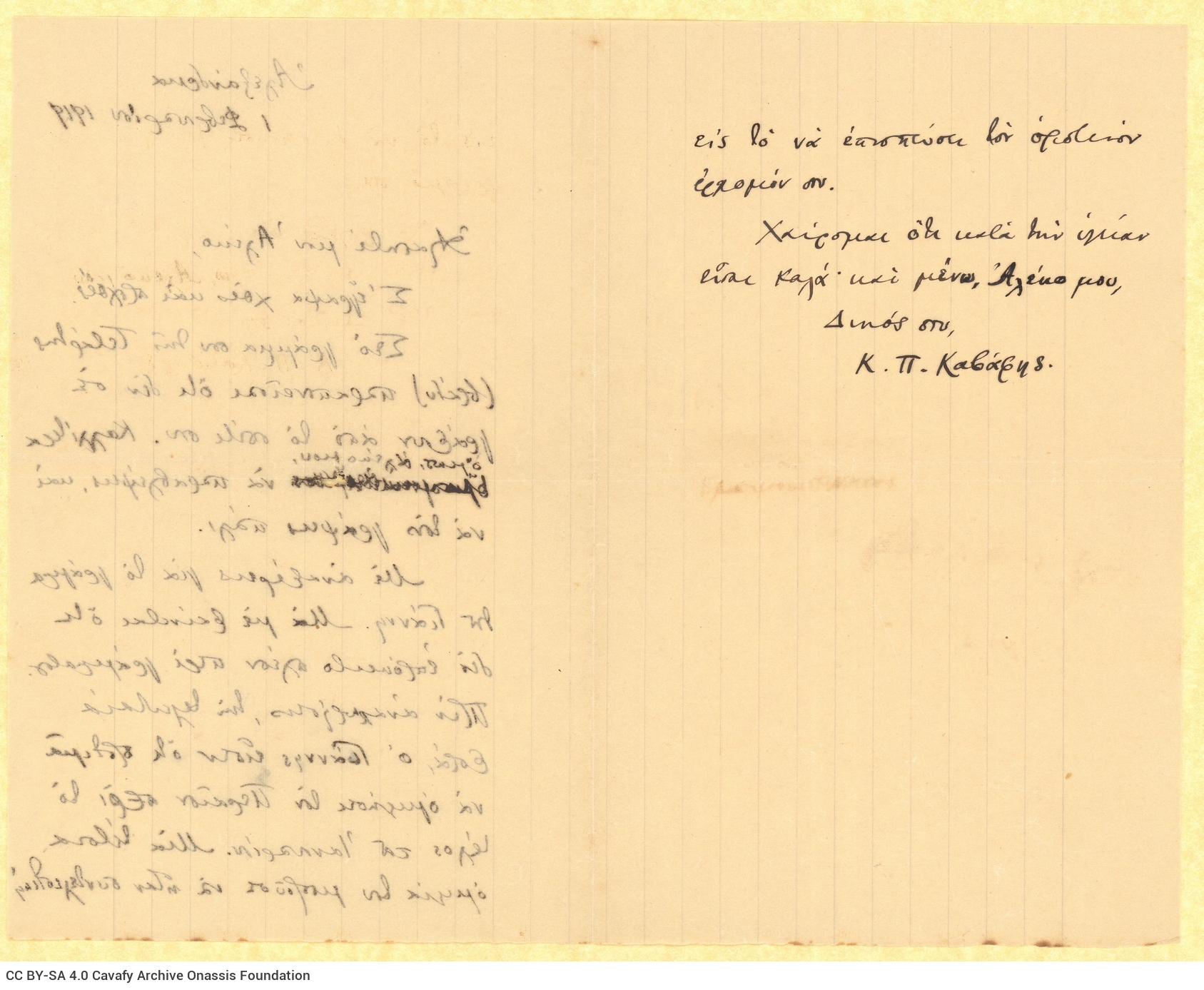 Letter by Cavafy to A. Singopoulo