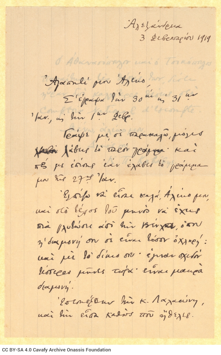 Letter by Cavafy to A. Singopoulo