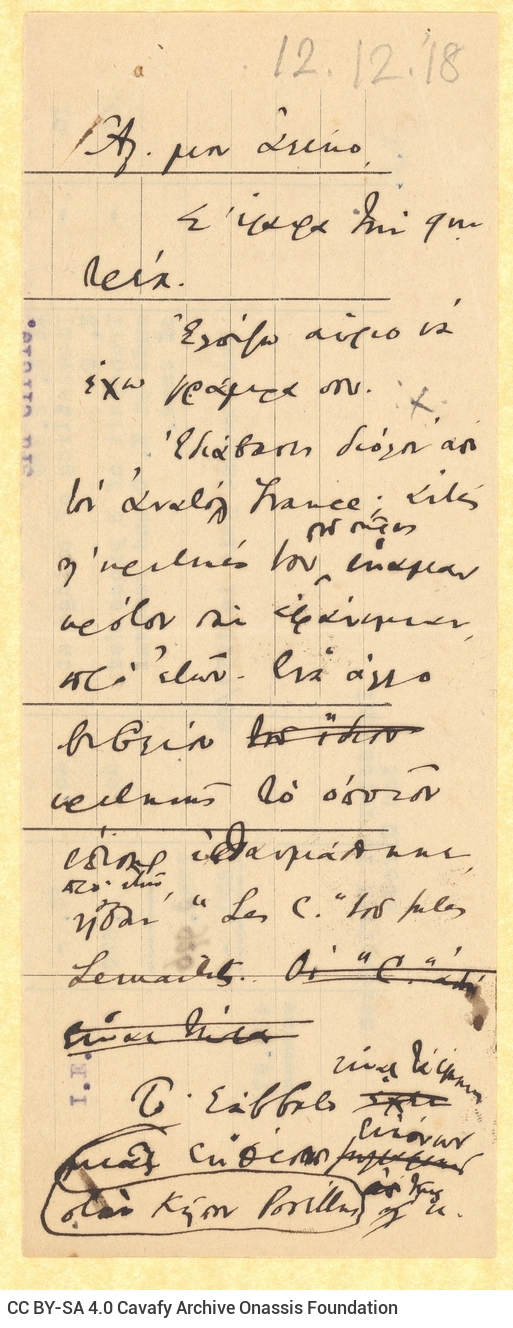 Σχέδιο επιστολής του Καβάφη προς τον Α. Σεγκόπουλο