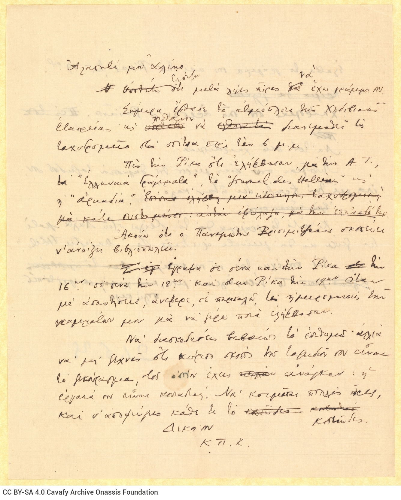 Σχέδια και αντίγραφα επιστολών του Κ. Π. Καβάφη