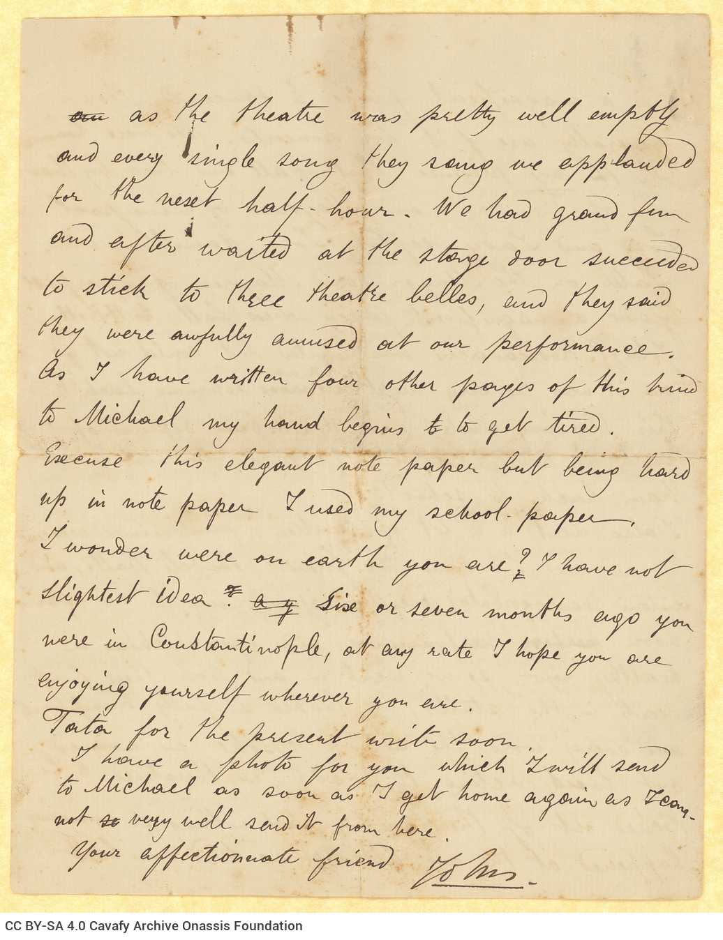 Letter by John Rodocanachi to Cavafy