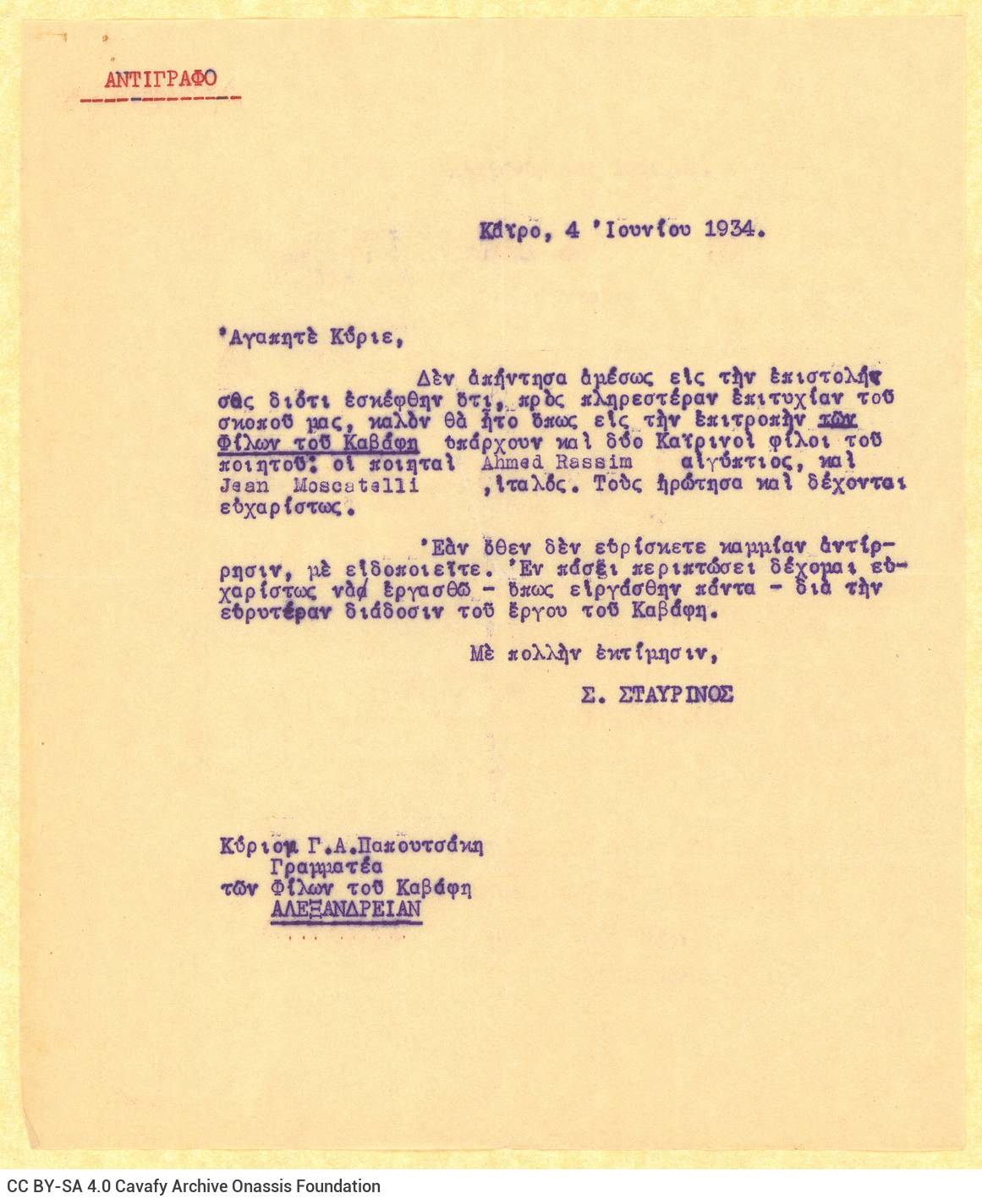 Letter by G. A. Papoutsakis To R. Singopoulo