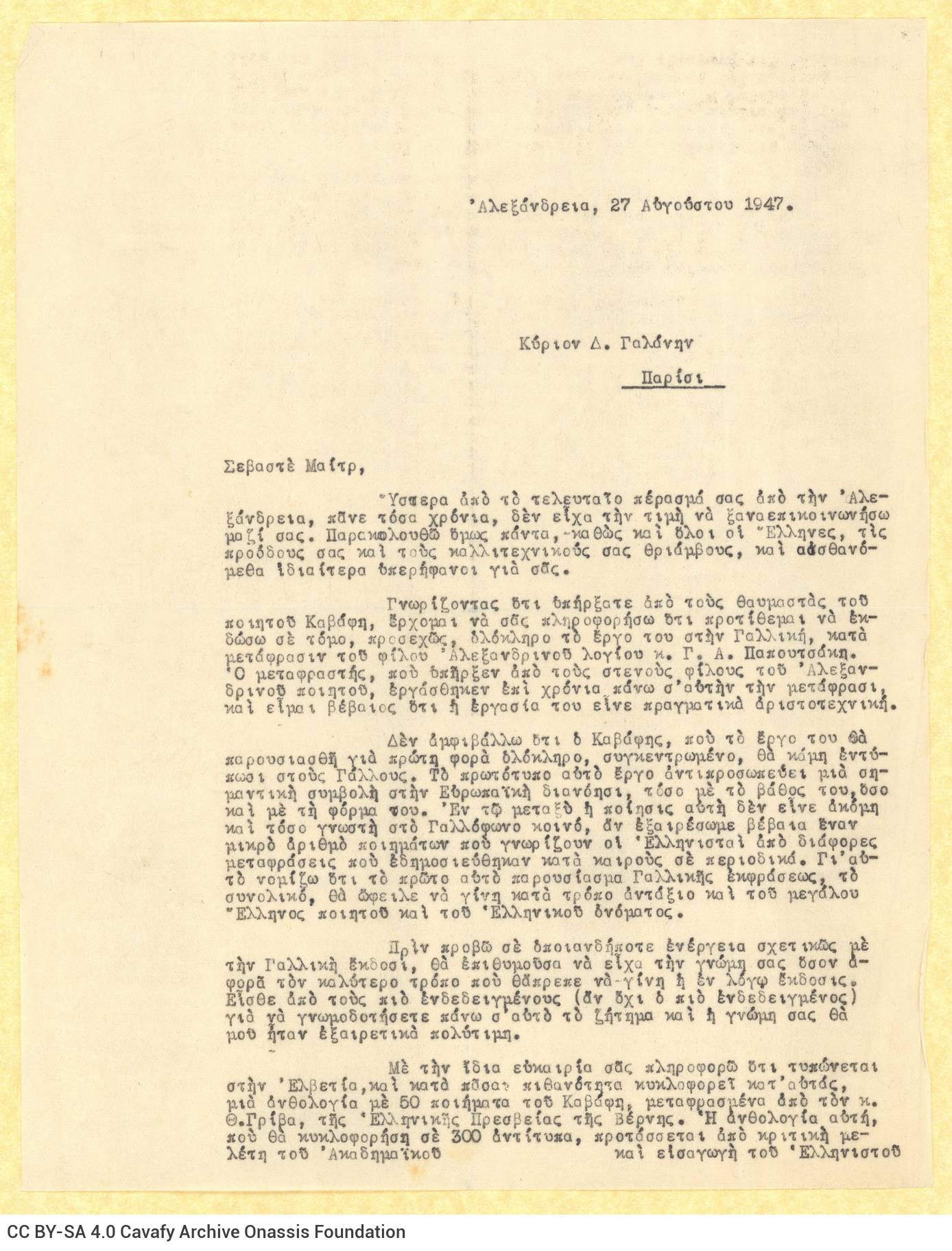 Αντίγραφο επιστολής του Α. Σεγκόπουλου προς τον Δ. Γαλάνη