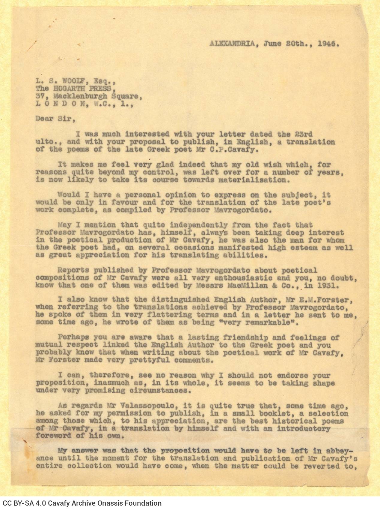 Αλληλογραφία του Αλέκου Σεγκόπουλου με τον εκδοτικό οίκο The Hogarth Press