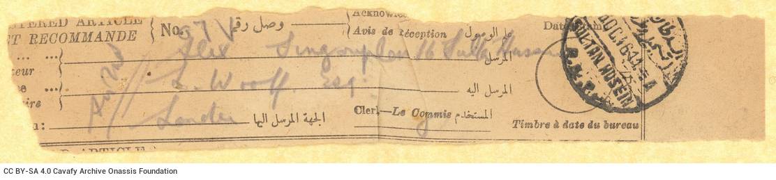 Αντίγραφο επιστολής του Α. Σεγκόπουλου προς τον L. Woolf