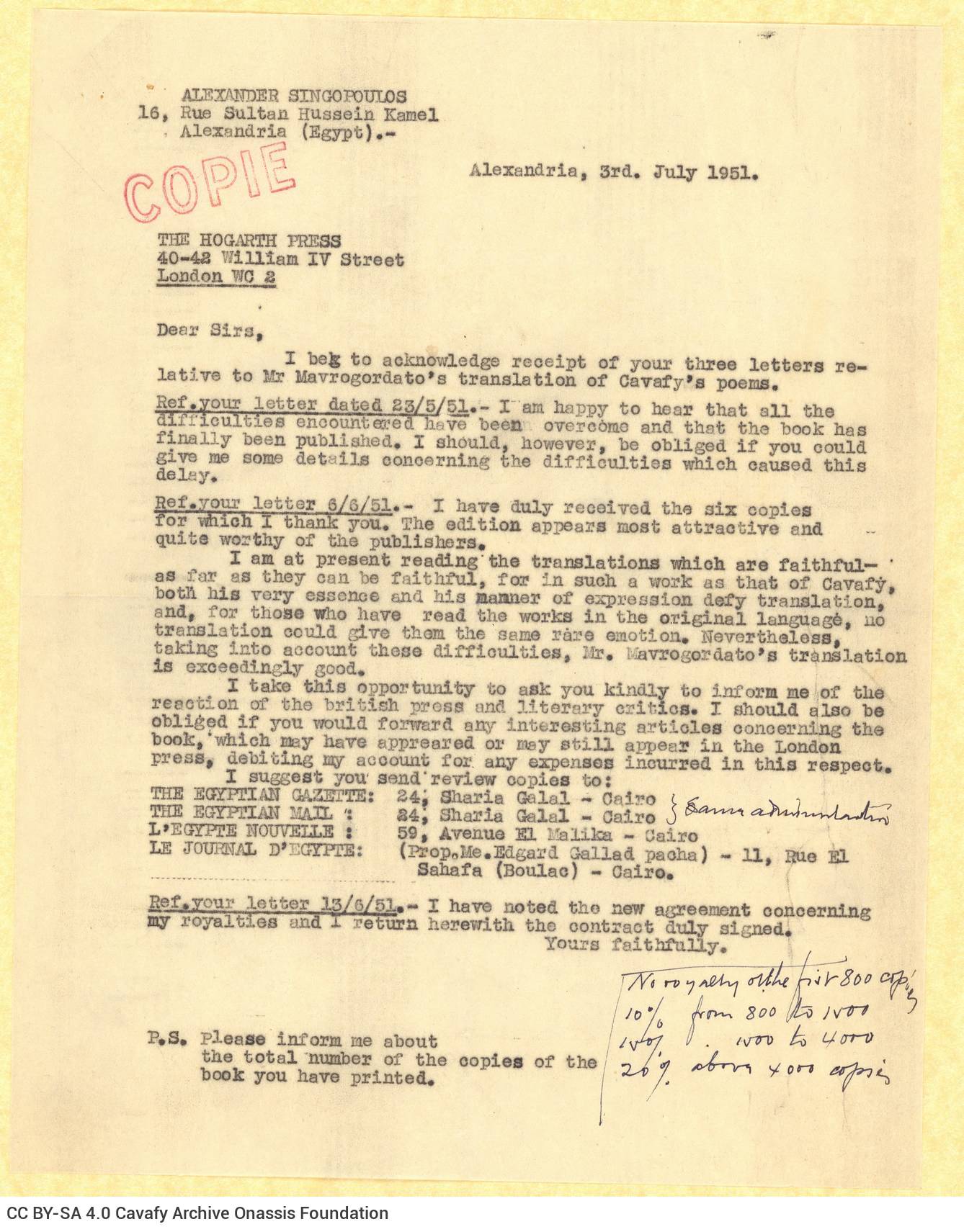 Copy of a letter by A. Singopoulo to The Hogarth Press