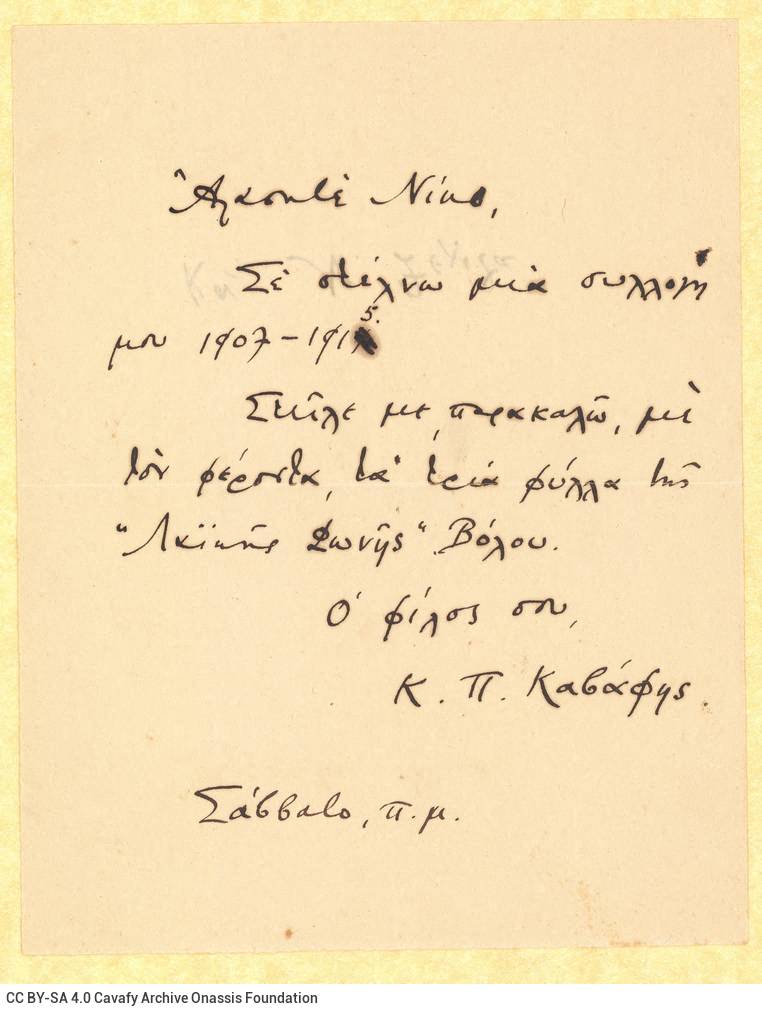 Short letters and notes by Cavafy to Eftychia and Nikos Zelitas.