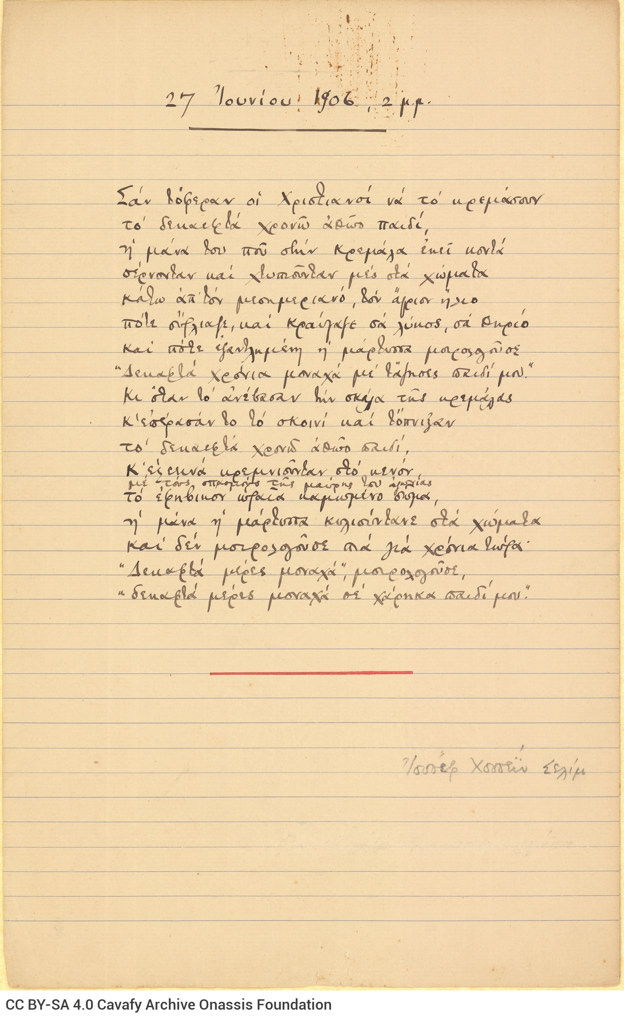 Cavafy, C. P.. “27 June 1906, 2 P.M.”. Poem (manuscript), n.d.. GR-OF CA CA-SF01-S01-F01-SF001-0121 (129), Onassis Foundation C. P. Cavafy Fonds. From The Digital Collection of the Cavafy Archive, edited by Onassis Foundation, Athens, last modified 01.10.2025. https://doi.org/10.26256/CA-SF01-S01-F01-SF001-0121.