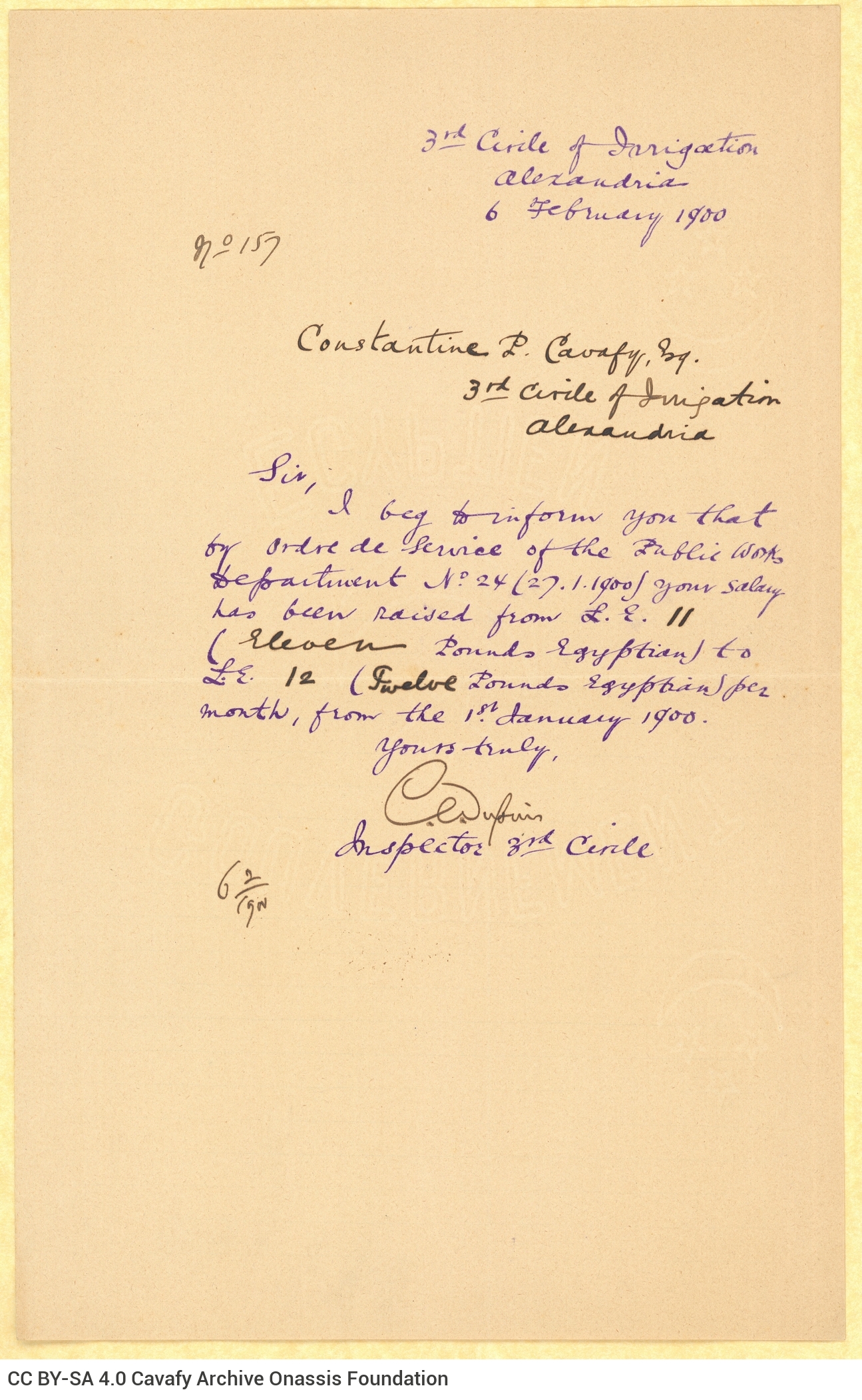 Handwritten copy of a letter on the first page of a double sheet notepaper. It is signed by the Inspector of the 3rd Circle of Irrigation and mentions Cavafy's salary raise from 11 to 12 pounds per month. The handwriting is Cavafy's. (Alexandria)