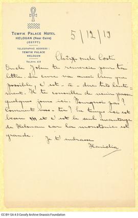 Handwritten letter by Charikleia Cavafy (Valieri) to Cavafy on one side of a letterhead of the Tewfik Palace Hotel. She invites the poet to visit her and John at Heluan. (Heluan)