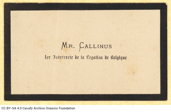 Printed visiting card of Ch. Callinus, second husband of Cavafy's aunt, Amalia (Fotiadi Psylliari), who was working with the Belgian diplomatic delegation as interpreter.