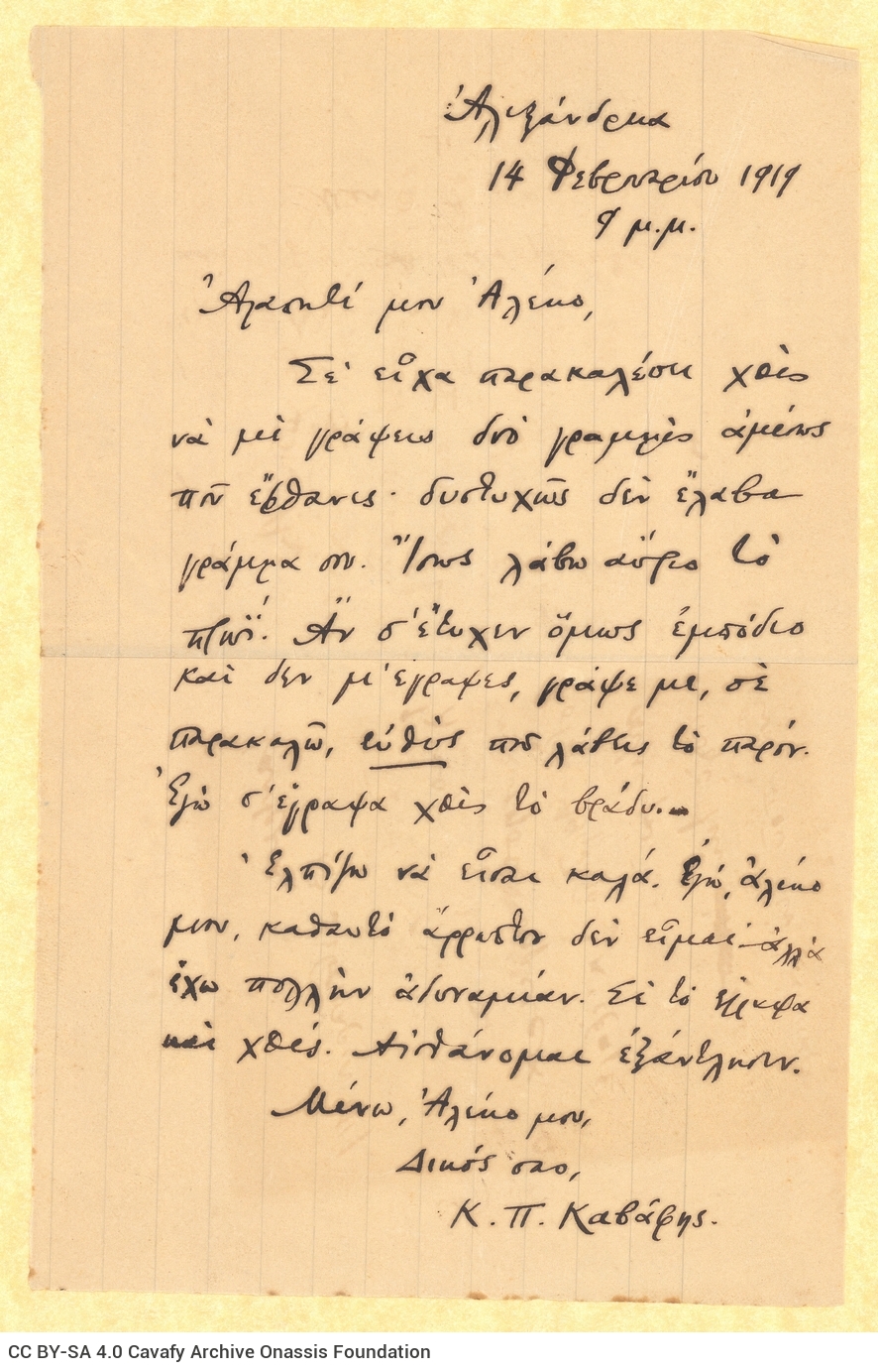 Cavafy, C. P.. “Letter by Cavafy to A. Singopoulo”. Letter, 14.02.1919. GR-OF CA SING-S01-F02-SF001-0057 (1458), Onassis Foundation Alekos & Rica Singopoulo Fonds. From The Digital Collection of the Cavafy Archive, edited by Onassis Foundation, Athens, last modified 01.10.2025. https://doi.org/10.26256/SING-S01-F02-SF001-0057.