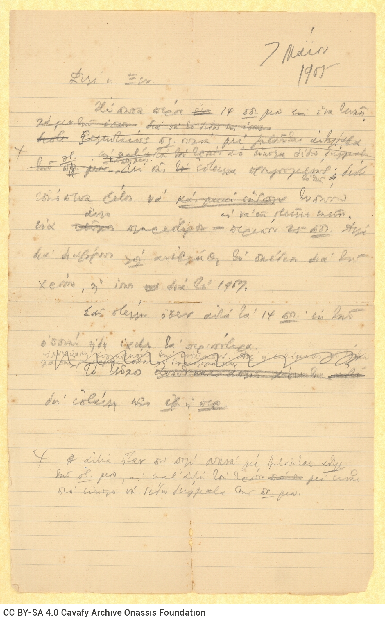 Cavafy, C. P.. “Draft letter by C. P. Cavafy to Grigorios Xenopoulos.”. Letter (draft), 07.05.1905. GR-OF CA CA-SF02-S01-SS01-F17-SF003-0009 (492), Onassis Foundation C. P. Cavafy Fonds. From The Digital Collection of the Cavafy Archive, edited by Onassis Foundation, Athens, last modified 01.10.2025. https://doi.org/10.26256/CA-SF02-S01-SS01-F17-SF003-0009.