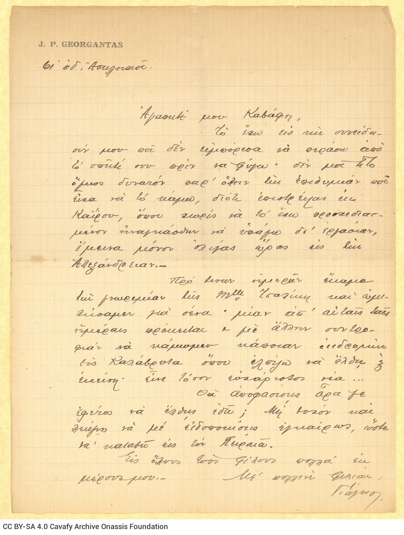Georgantas, J.P. [Ioannis / Giagkos]. “Letter by G. Georgantas to Cavafy”. Letter, n.d.. GR-OF CA CA-SF02-S01-SS01-F18-SF003-0168 (1238), Onassis Foundation C. P. Cavafy Fonds. From The Digital Collection of the Cavafy Archive, edited by Onassis Foundation, Athens, last modified 01.10.2025. https://doi.org/10.26256/CA-SF02-S01-SS01-F18-SF003-0168.