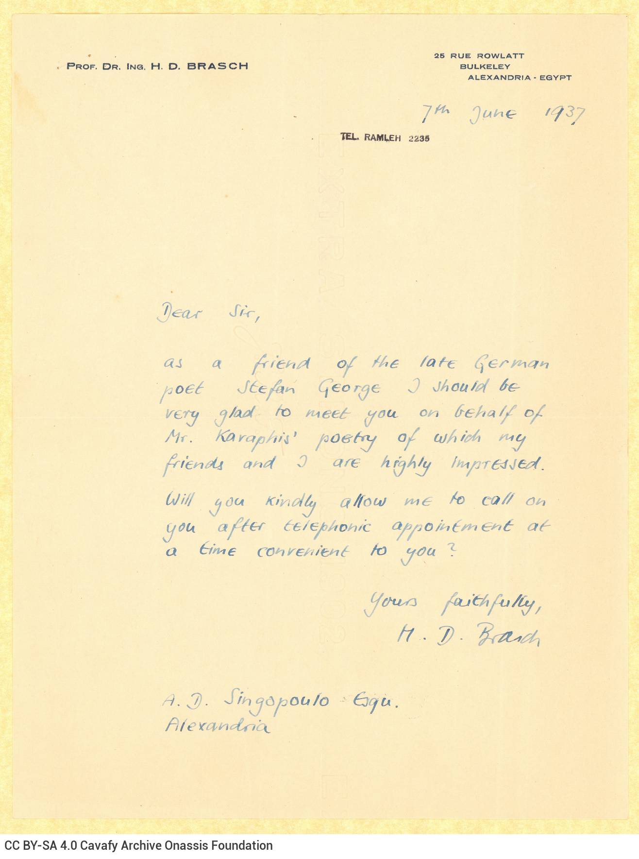 Handwritten letter by professor H. D. Brasch to Alekos Singopoulo on one side of a letterhead with the sender's name and address in Alexandria in print. Blank verso. He asks to meet with Singopoulo for reasons related to Cavafy's poetic work.