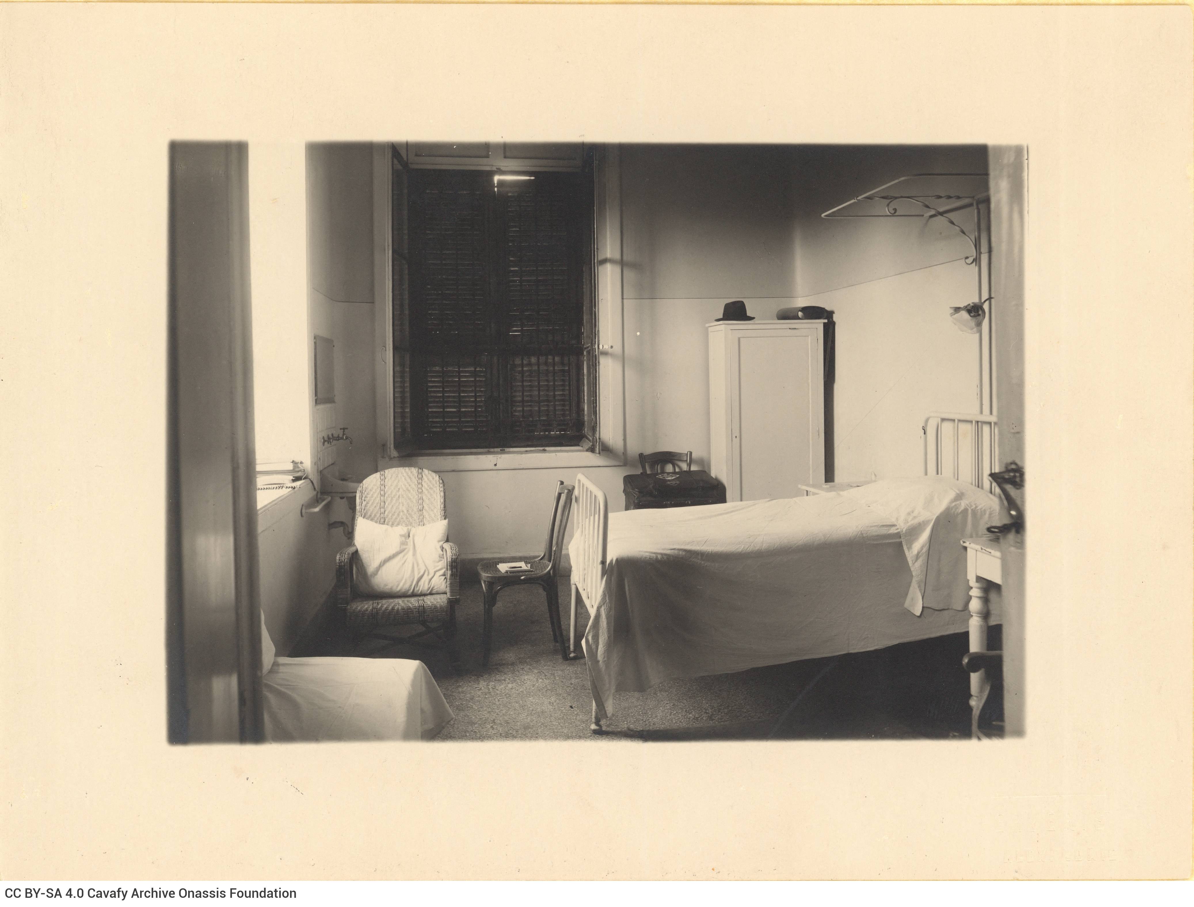 Photograph of the room in the Greek Hospital of Alexandria where Cavafy died. Some of his personal items can be seen, such as his hat and the notepad with the pencil. Three copies. On the verso of one of them, the rubber stamp "Cavafy Archive phot. 8". All copies bear the embossed stamp of the photographer, Apostolos Ververis (Ververis Alexandrie).