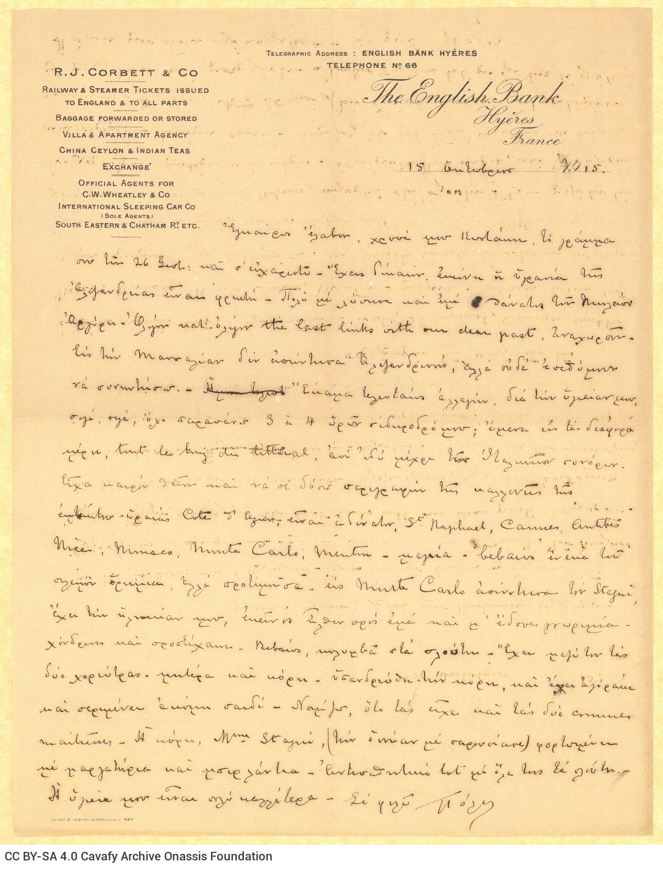 Handwritten letter by Paul Cavafy to C. P. Cavafy from Hyères, France, according to the letterhead. It is a reply to a letter by the poet, dated 26 September. Paul refers to a trip he made to the Côte d’Azur and to a meeting he had in Monte Carlo with an individual from their social circle. Of note is the use of English and French words and phrases in the flow of written discourse. (Hyères)