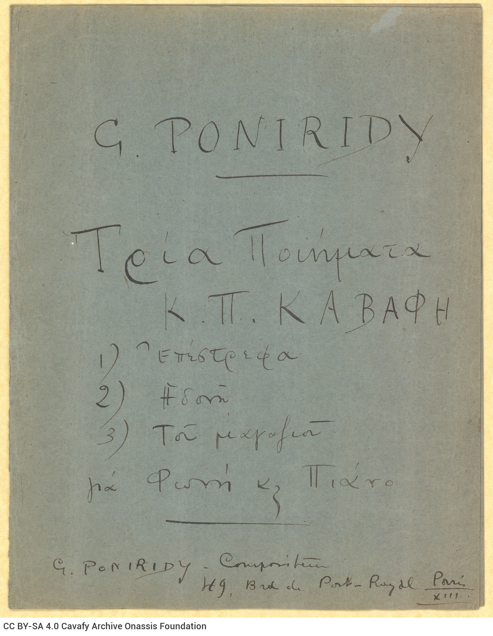 Poniridy, Georges. “G. Poniridy: Three poems by C. P. Cavafy”. Folder (handmade), n.d.. GR-OF CA CA-SF01-S04-F15-0001 (1317), Onassis Foundation C. P. Cavafy Fonds. From The Digital Collection of the Cavafy Archive, edited by Onassis Foundation, Athens, last modified 01.10.2025. https://doi.org/10.26256/CA-SF01-S04-F15-0001.