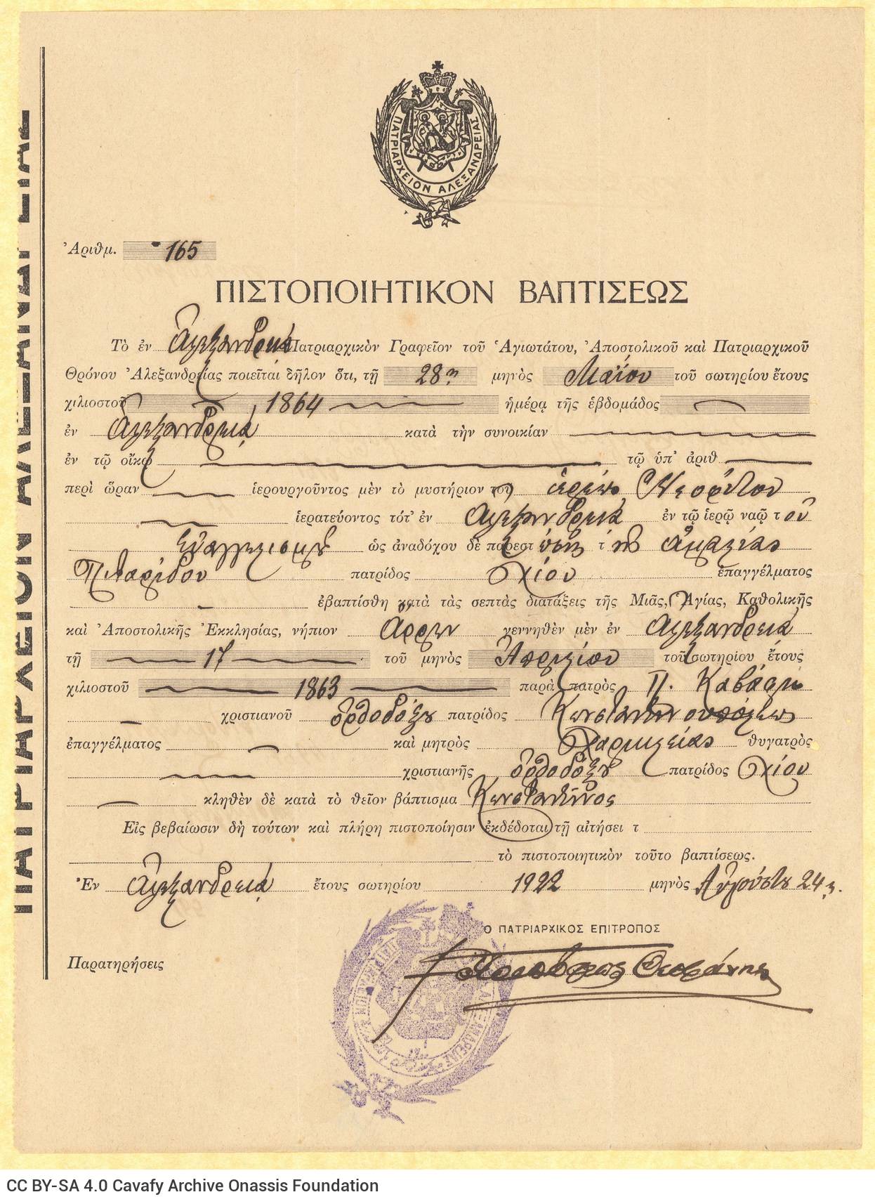 Πατριαρχείο Αλεξανδρείας, «Πιστοποιητικόν Βαπτίσεως» (24.08.1922), Πιστοποιητικό (βάπτισης), Αρχείο Κ. Π. Καβάφη του Ιδρύματος Ωνάση (Προσκτήσεις μετά το 2012), GR-OF CA CA-SF03-F29-0001 (1882), στο: Ψηφιακή Συλλογή του Αρχείου Καβάφη, επιμ. Ίδρυμα Ωνάση, Αθήνα, τελευταία ενημέρωση 01.10.2025: https://doi.org/10.26256/CA-SF03-F29-0001.