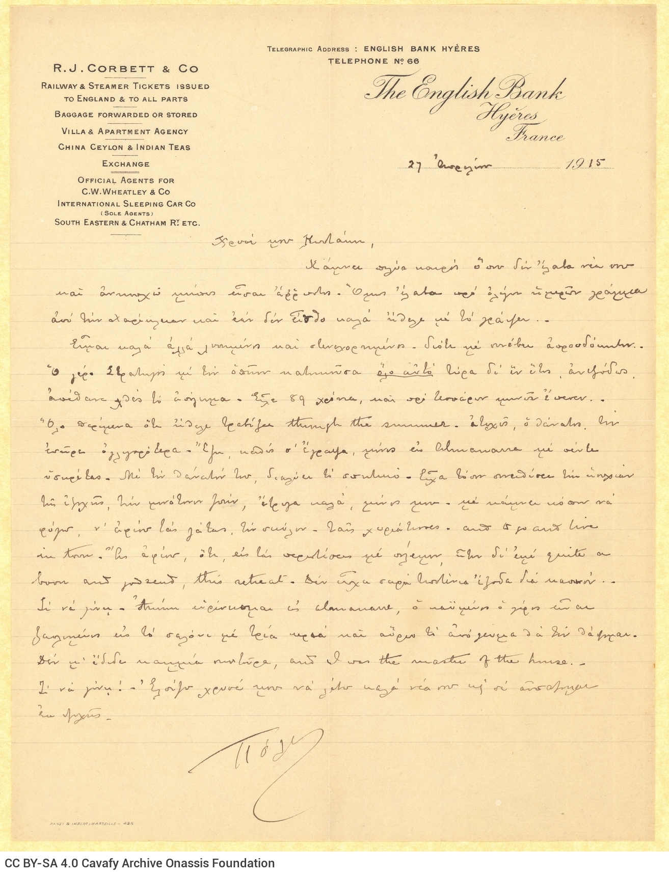 Handwritten letter by Paul Cavafy to C. P. Cavafy from Hyères, France, according to the letterhead, dated "27 April 1915". The largest part of the letter is devoted to the news regarding the death of general De Horsey, at whose service Paul Cavafy was, and the consequences of the event on himself. Paul is no longer worried about the interruption in the correspondence with his brother, C. P. Cavafy, after a letter he received from his niece, Charikleia. Of note is the use of English words and phrases in the flow of written discourse. (Hyères)