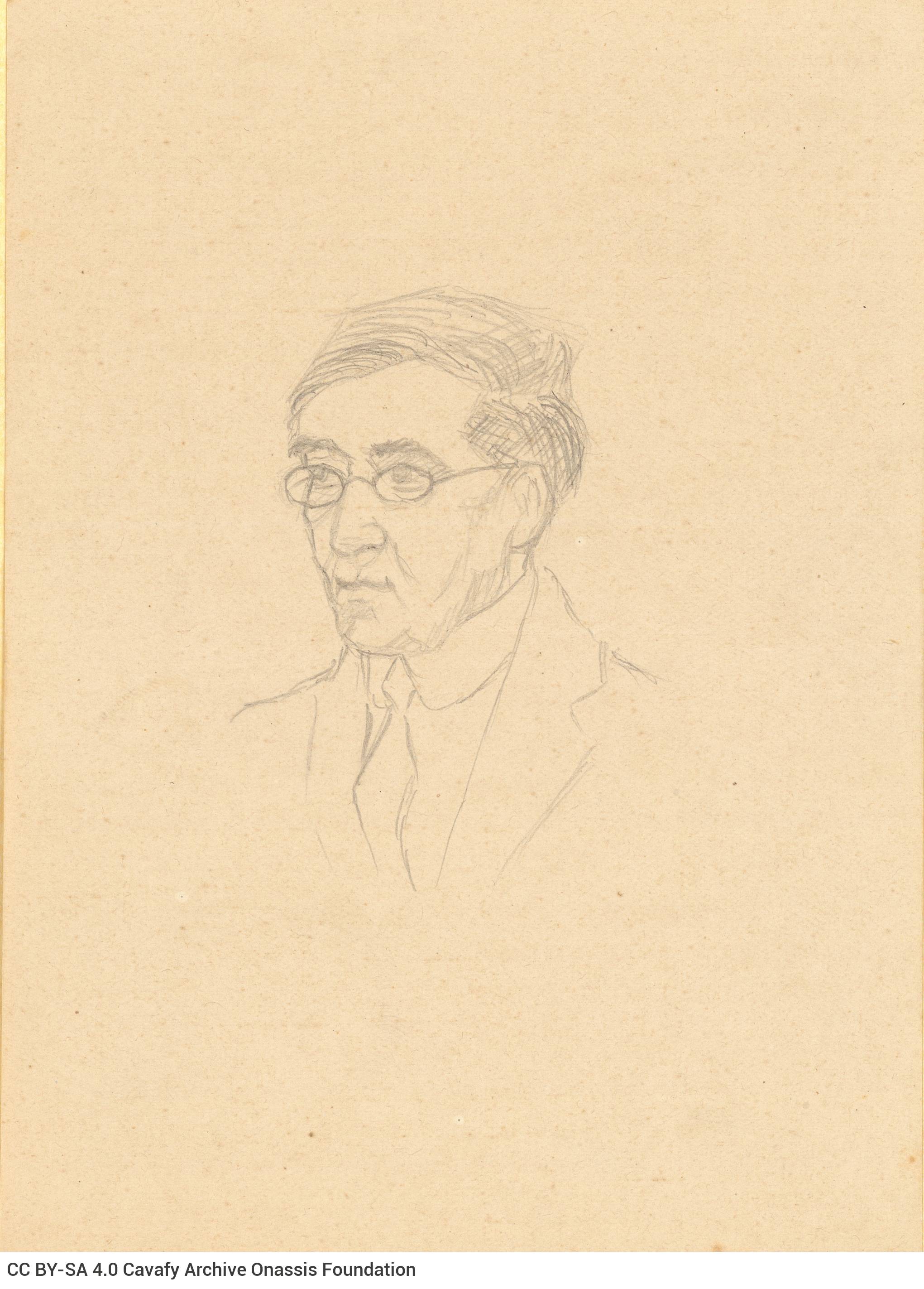 Sketch in pencil on one side of a piece of paper. Blank verso. It depicts a bust of Cavafy in three-quarter view, looking slightly to the left.