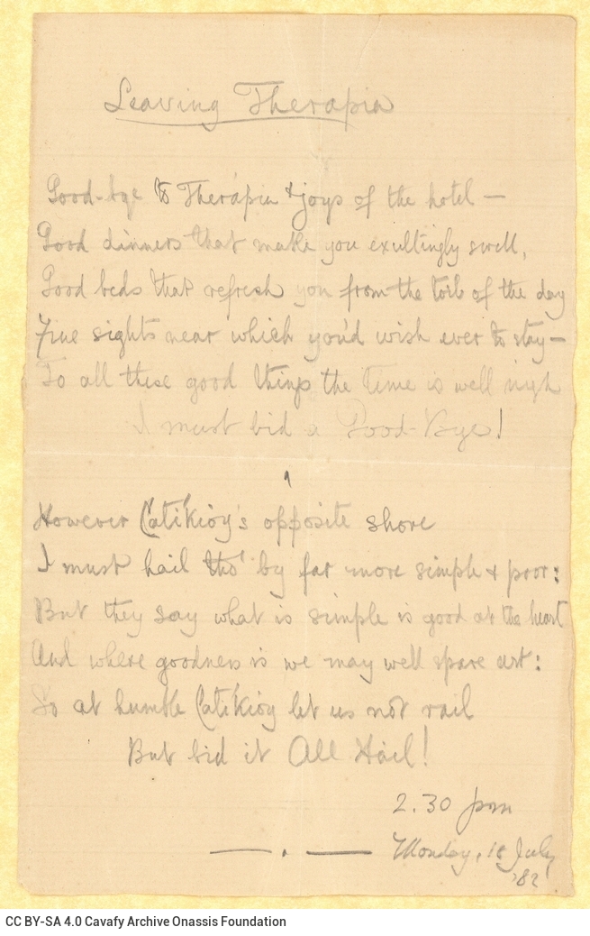 Cavafy, C. P.. “Leaving Therapia”. Poem (manuscript), July 1882. GR-OF CA CA-SF01-S01-F01-SF001-0001 (935), Onassis Foundation C. P. Cavafy Fonds. From The Digital Collection of the Cavafy Archive, edited by Onassis Foundation, Athens, last modified 01.10.2025. https://doi.org/10.26256/CA-SF01-S01-F01-SF001-0001.