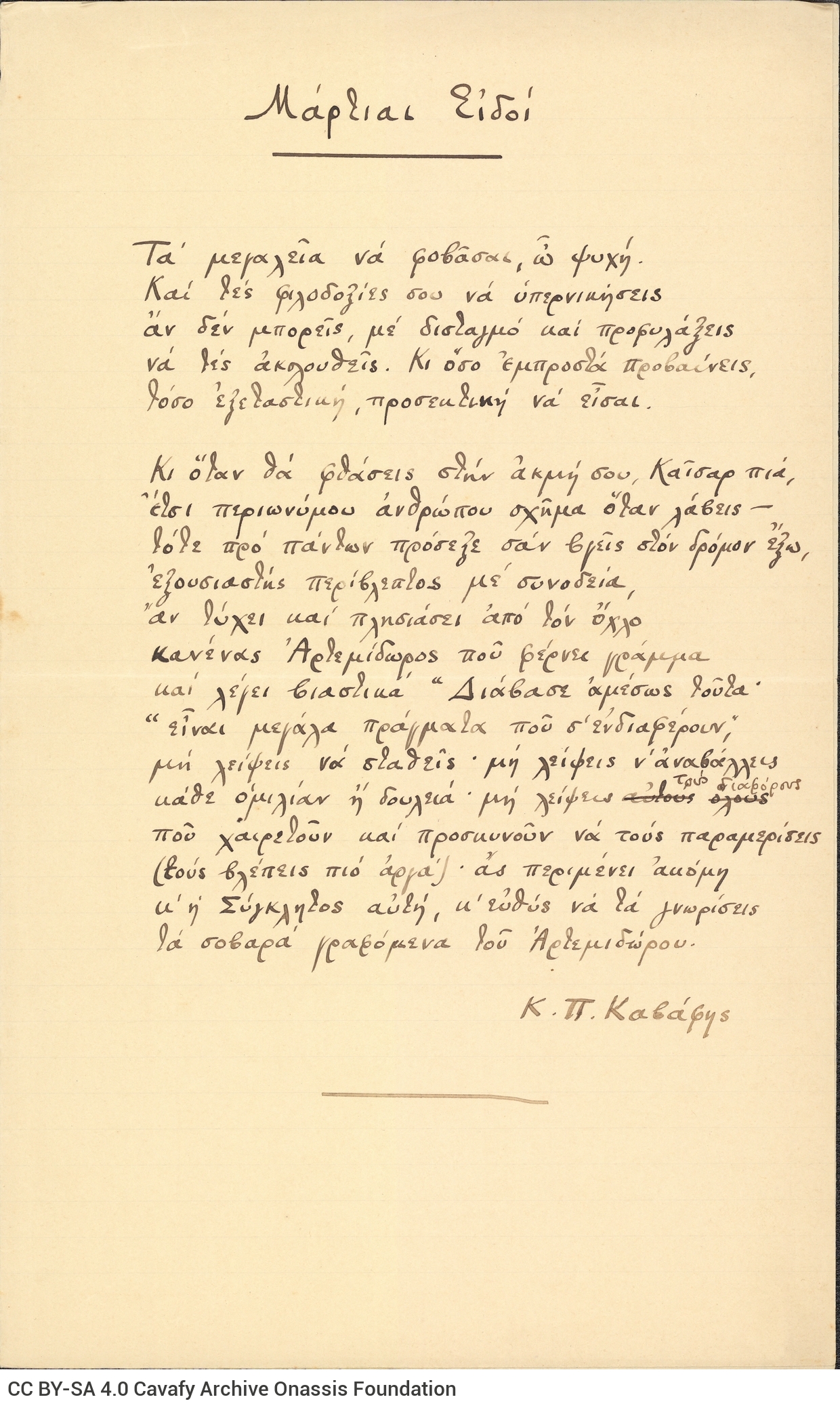 Cavafy, C. P.. “Ides of March”. Poem (manuscript), n.d.. GR-OF CA CA-SF01-S01-F01-SF001-0056 (16), Onassis Foundation C. P. Cavafy Fonds. From The Digital Collection of the Cavafy Archive, edited by Onassis Foundation, Athens, last modified 01.10.2025. https://doi.org/10.26256/CA-SF01-S01-F01-SF001-0056.