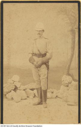 Photograph portrait of a standing man in a military uniform and colonial hat. He is wearing boots and gloves. The lower part of the recto, where the photographer's logo would normally be, has been cut off. Blank verso.
