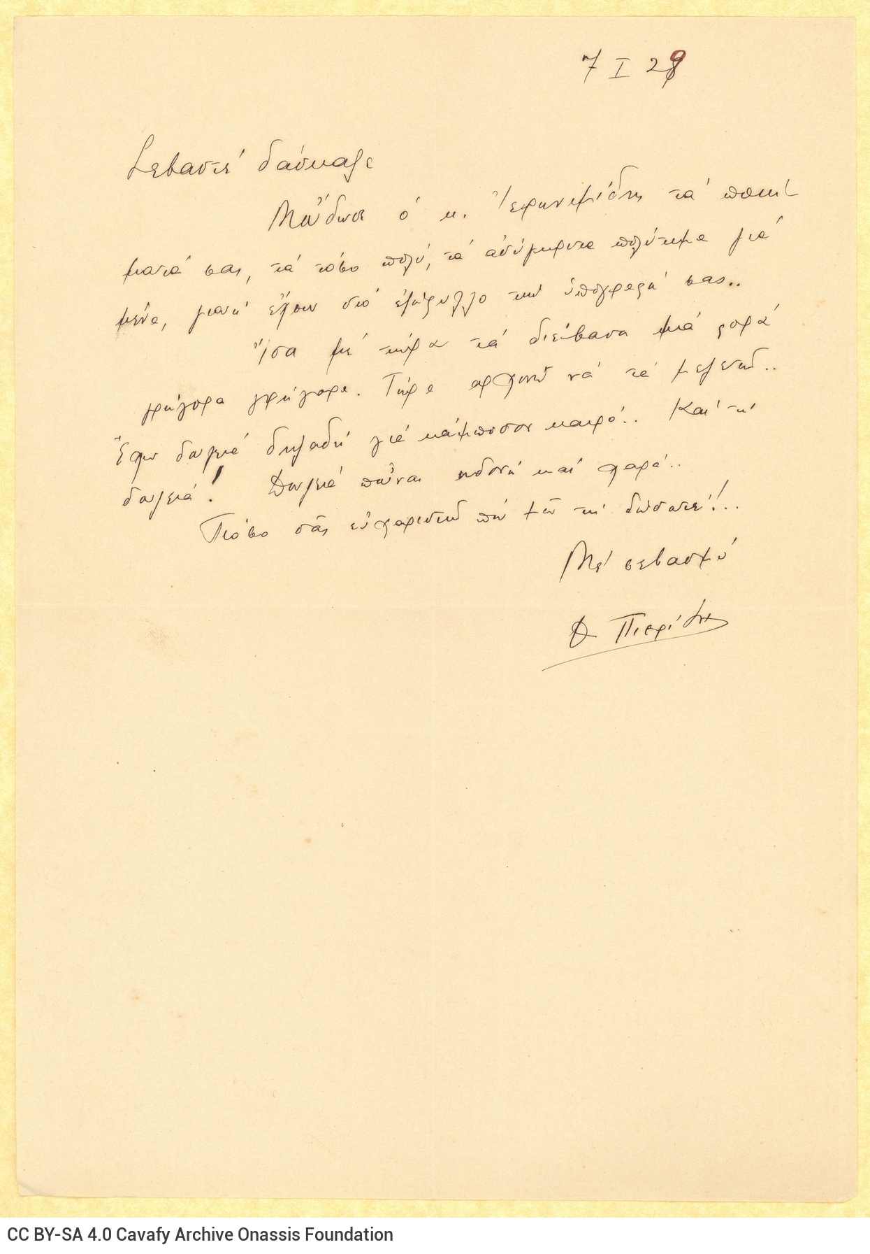 Επιστολή του Θ. Πιερίδη προς τον Καβάφη